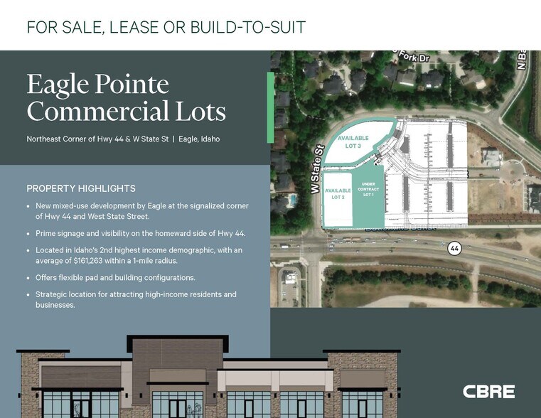 Flexible pad and building configurations with prime signage and visibility! Eagle Pointe Commercial Lots - Eagle's new mixed-use development at the prime signalized corner of Hwy 44 and West State Street. This strategic location boasts unparalleled visibility and signage opportunities on the homeward side of Hwy 44, ensuring your business stands out to the affluent demographic in Idaho's 2nd highest income area, where the average household income is an impressive $161,263 within just a 1-mile radius. With flexible pad and building configurations available, this development is perfectly designed to attract high-income residents and businesses alike.