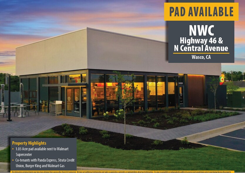 A 1.03-acre retail pad at the northwest corner of Highway 46 and North Central Avenue in Wasco, California. The site is strategically positioned adjacent to a high-traffic Walmart Supercenter, creating a strong draw for national and regional retailers. The property offers flexibility for a single occupant or multi-tenant development and is situated among an established mix of daily-needs and quick-service restaurant concepts. The surrounding trade area benefits from consistent traffic counts along Highway 46, which serves as a key east-west route through the city and a direct connection to State Highway 99. Nearby notable co-tenants include Panda Express, Burger King, Strata Credit Union, and Walmart Gas Station, ensuring significant cross-traffic. The pad's location within a densely developed retail corridor makes it a compelling choice for retailers seeking visibility and high consumer exposure.