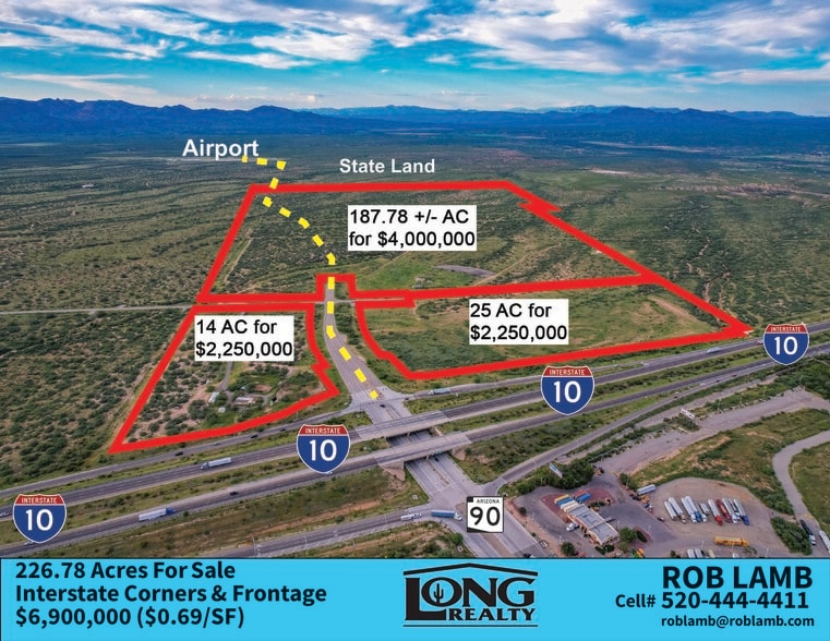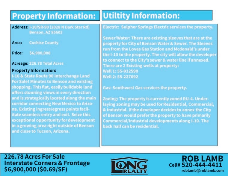 I-10 & State Route 90 Interchange Land For Sale! Minutes to Benson and existing shopping. This flat, easily buildable land offers stunning views in every direction and is strategically located along the main corridor connecting New Mexico to Arizona. Existing ingress/egress points facilitate seamless entry and exit. Seize this exceptional opportunity for development in a growing area right outside of Benson and close to Tucson, Arizona. Electric: Suplher Springs Electric services the property. Sewer/Water: There are 4 existing sleeves that are at the property for City of Benson Water & Sewer. The Sleeves run from the Loves Gas Station and Mcdonald’s under the I-10 to the property. The city will allow the developer to connect to the City’s sewer & water line if annexed. There are 3 Existing wells at property: Well 1: 55-912590 Well 2: 55-907594 Well 3: 55-227692 Gas: Southwest Gas services the property. Zoning: The property is currently zoned RU-4. Underlaying zoning may be used for Residential, Commercial, & Industrial. If the developer decides to annex the City of Benson would prefer the property to have primarily Commercial/Industrial developments along I-10. The back half can be residential.