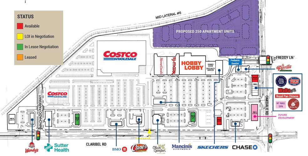 COSTCO Now Open at Crossroads West in Riverbank, CA Now Leasing Anchor & Pads in New 365,000 SF Development Delivery Scheduled for Spring 2025 -Join Costco, Hobby Lobby, Skechers, Wendy's, Raising Cane's and Chase Bank -Regional trade area serving Riverbank, NE Modesto, Oakdale and Escalon with daily needs, regional retailers and dining options -Brand new mixed use retail center offering anchor, drive-thru and pad opportunities -Captures a population of 372,000 and 121,500 households in a 15 minute drive time -Pedestrian friendly and within walking distance of multiple new large scale housing developments -Strategically located at the intersection of two major arterials (Claribel Rd – 25,553 ADT and Oakdale Rd – 19,136 ADT)
