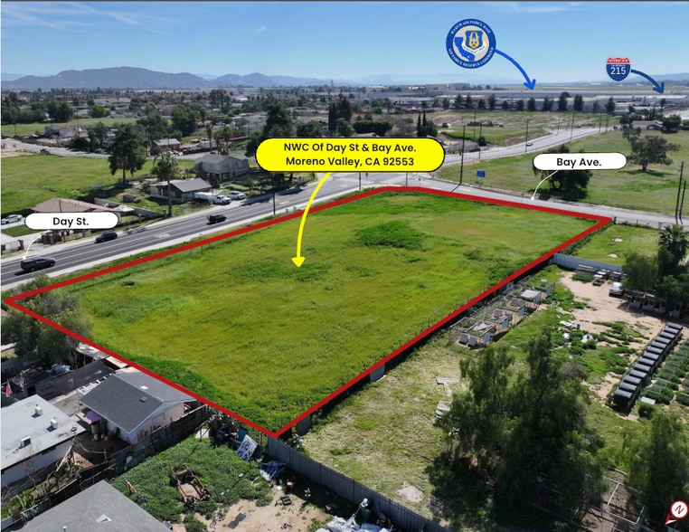 Highly visible corner industrial lot with street frontage and access. Features curb, gutter, and sidewalk improvements along Day St. ±1.5 miles from March Air Reserve Base with quick access to I-215 via E. Alessandro Blvd and minutes to the 60 FWY.