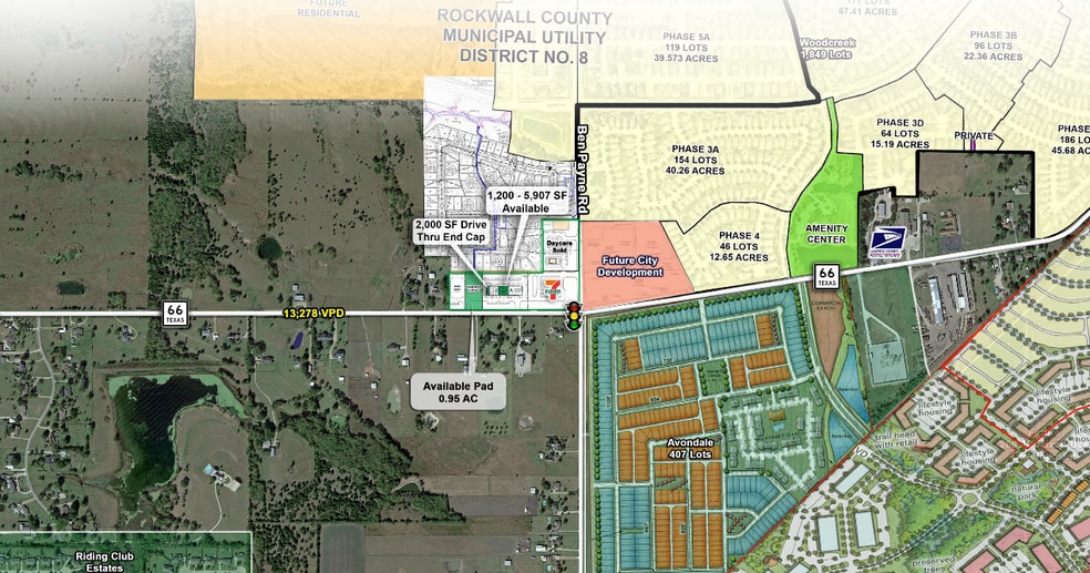 Join 7-Eleven on State Highway 66 in the master planned community of Woodcreek, located in Fate, Texas only minutes from The Harbor Rockwall Town Center and Lake Ray Hubbard. Woodcreek is a one-of-kind community where family and friends come together to enjoy all that Fate area has to offer. Friendly neighborhoods of beautiful single family homes combined with two top rated elementary schools, make Woodcreek the ideal place to call home. More than 1,500 families already live here and seven active builders are constructing homes from the $200K to $500K range and all but 200 lots are either sold to builders or developers with builder commitments.