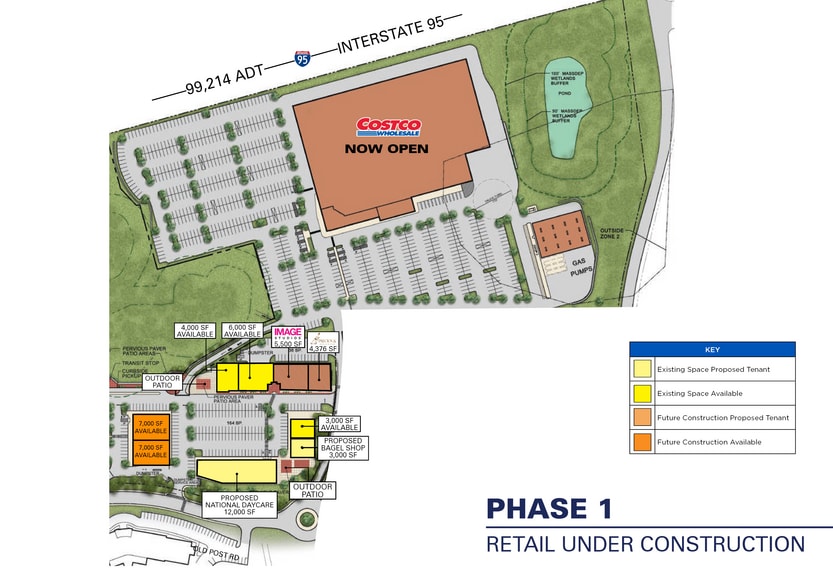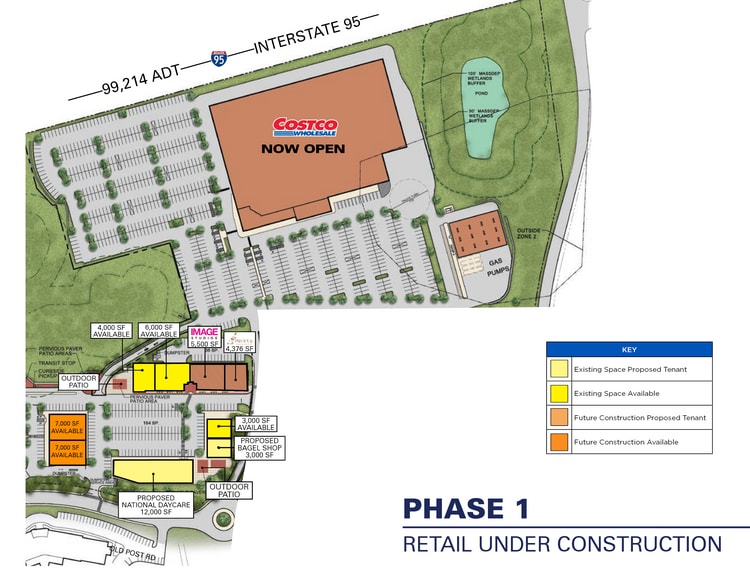 • Join the newest Massachusetts Costco in more than 20 years | Now Open! • Phase 1 Retail Under Construction: 2,000 - 20,000 SF Available • Phase 2 Retail Coming Soon • 180 Future Residential Units • Located directly off I-95 - Exit 17 • Pylon Signage Available • Interstate 95 - 99,214 ADT • South Main Street - 17,703 ADT