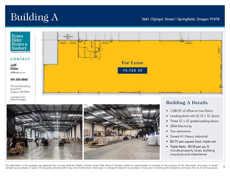 BUILDING A | 19,720 SF • 1,280 SF of office on two floors • Loading dock with two 12’ x 12’ doors • Three 12’ x 12’ grade loading doors • 200A Electricity • Two restrooms • Zoned HI | Heavy Industrial • $0.75 per square foot, triple net • Triple Nets: $0.18 per sq. ft. include property taxes, building insurance and water/sewer