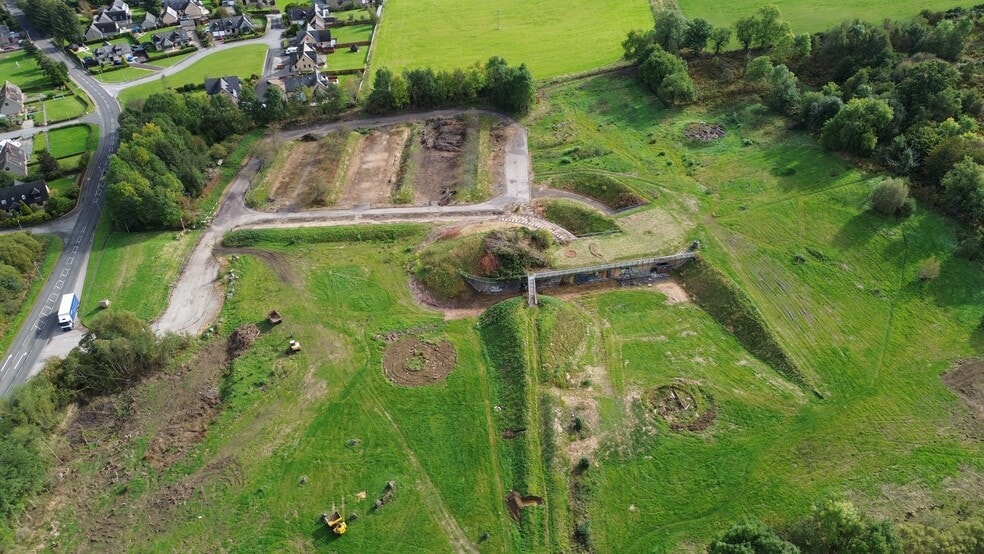 Archaeolink exhibition and visitor centre. The structure has been designed to meld into its rural setting so that the landscape rolls across. Across the roof is grass, which rises like a conical hill similar to its surroundings.