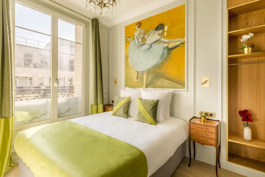 SPECIAL INVESTISSEUR vente uniquement de murs loués Au coeur du quartier Louvre Palais Royal et Opéra Dans un immeuble de bon standing de 1880, Au 4ème étage accessible par ascenseur, des bureaux loués de 150 m² avec changement de destination pour exploitation en 'hébergement hôtelier' par un locataire Opérateur et gestionnaire reconnu. Plateau climatisée et aménagée actuellement avec une entrée privée desservant 2 appartements type haussmannien F4 / F3 avec Family room, des chambres associés avec des salles de bains ou salles d'eau avec une prestations de type haussmannien (belle hauteur sous plafond de l'ordre de 2,8 m) donnant sur la rue et cour principale d'immeuble Conditions locatives / nous consulter