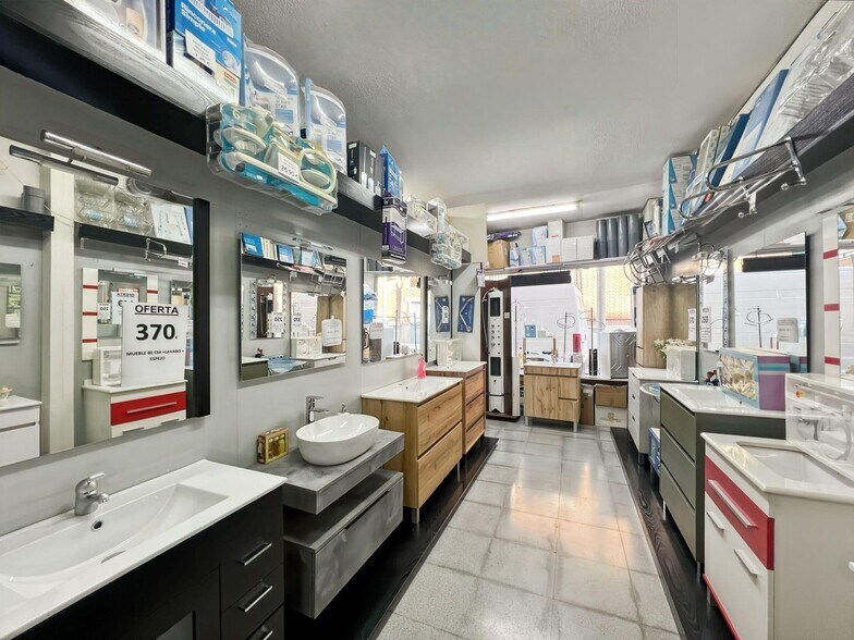 El local cuenta con una superficie total de 198 m2. La distribución actual incluye una zona de tienda o exposición de más de 100 m2, un área de caja y almacén abierto de 30 m2 y un almacén adicional de 19 m2 sin acceso al público. Dispone de tres aseos. La altura interior es de casi 3 m. La fachada mide 11 m y está dividida en dos escaparates que aportan iluminación natural.