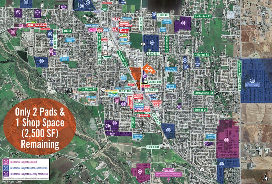 The property at Highway 25 and Tres Pinos Road is a fully entitled retail development in Hollister, California, an increasingly attractive community experiencing substantial growth. With permit-ready anchor, mid-box, and shop spaces available, the center's tenants will enjoy exposure to over 8,000 daily vehicles on Highway 25. In addition to these strong traffic generators, the center sits on a corner parcel with multiple signalized intersections, providing easy access and ample parking. Co-tenants in the center include national brands TJ Maxx, Ross, Chipotle, Walgreens, Panera, Saladworks, Aspen Dental, Smashburger, Denny's, and Famous Footwear. Surrounding demographics are strong, with a steadily growing population of over 54,000 residents and an average household income of over $107,000 in a five-mile radius. Rapidly expanding residential development surrounds the property, with over 4,000 units under construction or planning, hypothetically adding 15,870 new residents to the area. Additional traffic is produced by nearby Pinnacles National Park, which sees over 390,000 visitors every year.