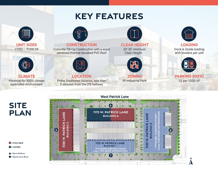 For more information contact Lauren Willmore at 702-369-4825 or email at lauren.willmore@cbre.com. Welcome to Mountain West Industrial Park Phase II, a state-of-the-art industrial park designed to meet the needs of modern businesses in the Las Vegas market. The park features a variety of unit sizes and configurations, ranging from 7,150 - 71,100 SF to accommodate diverse operational requirements. Strategically located on W. Patrick Lane & S. Tenaya Way. this premier industrial facility offers unparalleled access to major highways (I-215/I-15) and is less than a 1-day truck drive from California, Arizona, Utah, Idaho, Oregon, Washington, Wyoming, Montana, and New Mexico. Zoned for Versatility: The project is zoned (IP) Industrial Park within Clark County jurisdiction, which allows for a variety of industrial uses, including light manufacturing, e-commerce, recreational, warehouse, and R&D.