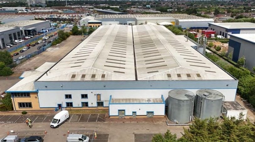 Industrial warehouse unit currently being refurbished. Originally constructed around 1995, with an extension added to the original structure around 2000. The main structure comprises a two bay steel portal frame surmounted by a hipped pitched roof with profile metal sheet and double skin glass-reinforced plastic rooflights.