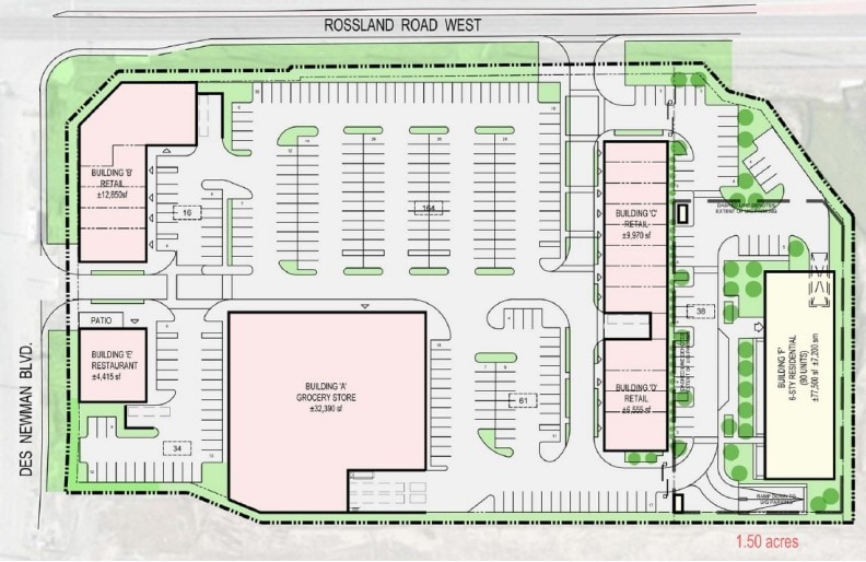 Located at the southeast corner of Rossland Road West and Des Newman Boulevard. Spaces available ranging from 1,200 to 40,000 square feet.