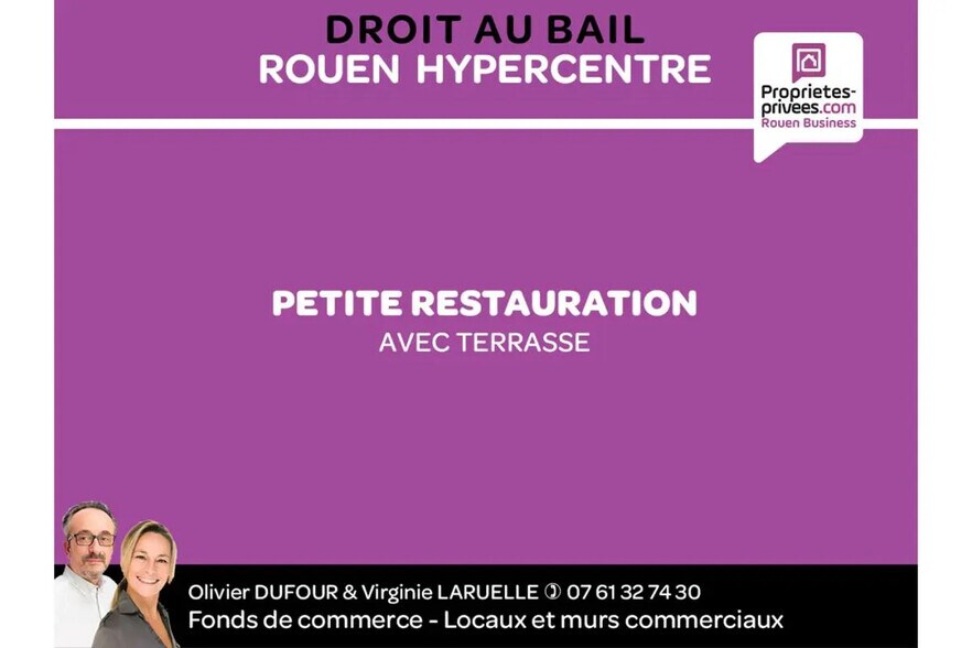 76000 ROUEN HYPER CENTER - Olivier DUFOUR and Virginie LARUELLE present this well-located fast food business in the pedestrian area near the Cathedral. The premises offer a nice air-conditioned sales space of approximately 50 m², a kitchen/storage area of 15 m², and a basement. Large storefront with 7 linear meters. Beautiful terrace on a busy pedestrian street. Lease 3/6/9 allowing for a tea room, small savory and sweet food service. No extraction or odorous activities allowed. Monthly rent of 2500 euros excluding tax, including condominium charges and property tax. Transfer of lease rights at the price of 60,000 euros. Mandate No. 423785. To visit, contact Olivier DUFOUR and Virginie LARUELLE at 07..61.32.74.30 or o.dufour@proprietes-privees.com, business agents for SAS PROPRIÉTÉS PRIVÉES, FNAIM member - RCS 501663231 (EI) 832048904 ROUEN REAL ESTATE. Information on the risks to which this property is exposed is available on the Géorisques website: www.georisques.gouv.fr. Condominium of 5 lots. Annual charges: 1620 euros. VIRGINIE LARUELLE OLIVIER DUFOUR (EI) Commercial Agent - RSAC Number: ROUEN 832048904.