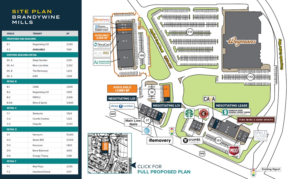 • Pad space available, up to ± 7,991 SF contiguous space • Wegmans anchored, providing exceptional trade area boundaries and weekly trip generation • Enhanced co-tenancy with national QSR concepts, medical, boutique fitness, and service retail • The development combines significant foot traffic with best in class retail brands • Visibility and signalized access from both Route 1 and Route 202 via the existing Loop Road • Well positioned to capitalize on the surrounding medical facilities and strong daytime population • Pylon and monument signage available along Route 202 and Route 1
