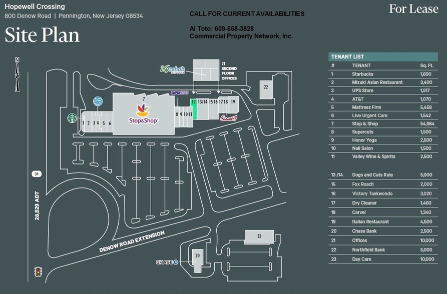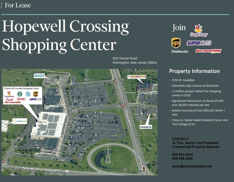 Hopewell Crossing Center with a Stop and Shop Supermarket, Starbucks, Restaurants and many shops and Bank on site. Located on Rte.31 North and Denow Road. Easy access to I 95. Will build out to office specs . Only 1 spaces left in the entire center. 2500sf can be subdivided.