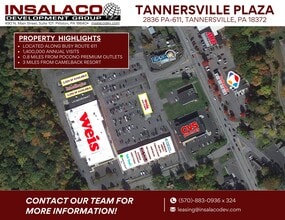 Tannersville Plaza is located in Pocono Township, Monroe County, Pennsylvania. The Pocono Mountains is approximately 2 hours from Philadelphia, Harrisburg or Trenton and 1.5 hours from New York City. Major area developments include the proposed $400 million Pocono Springs Entertainment Village and 130,000 square foot expansion of Kalahari Resort’s convention center. Nearby area attractions include Pocono Premium Outlets, Cambelback Ski Resort and Waterpark, Pocono Manor Resort, Great Wolf Lodge and Mt. Airy Casino Resort. Sanofi Pasteur and Pocono Mountain School District are also in close proximity. Population of 25,757 with a median household income of $ 77,699 within 5 miles.