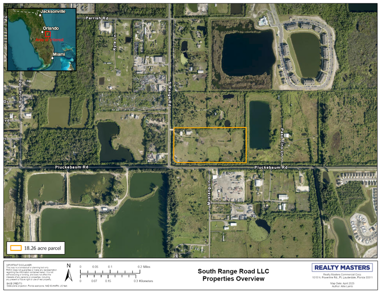 Address: NE Corner of Pluckebaum Rd & S. Range Rd, Rockledge, FL Municipality: Unincorporated Brevard County (Rockledge annexation likely) Site Size: 18.26 Acres (1 Parcel) Current Zoning: AU – Agricultural Residential Future Land Use : Western Half: NC Neighborhood Commercial and Eastern Half: RES 4 (4 Units/Acre) Utilities: Water and sewer connection likely available through City of Rockledge Parcel ID: 24-36-31-00-503 Frontage: Pluckebaum Road & South Range Road