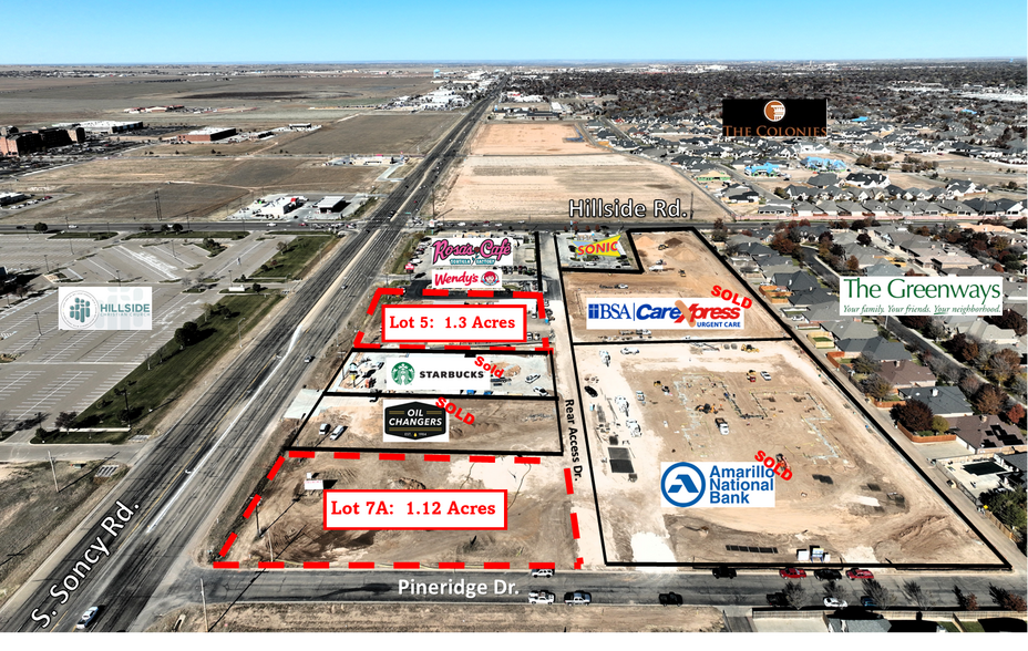 Lot 7A: Hard corner retail pad site. Lot is 1.12 acres on the hard corner of Soncy & Pineridge. Lot has 173' on Soncy x 281.75' on Pineridge. Asking $25/sf.