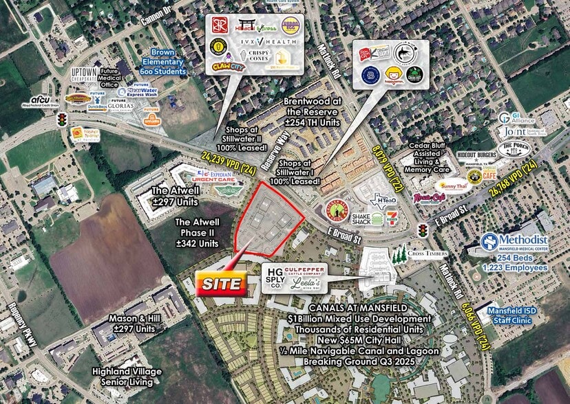 - Part of Canals at Mansfield, a $1 billion mixed-use development with thousands of residential units, a new $65M city hall, 1/2 mile canal & lagoon