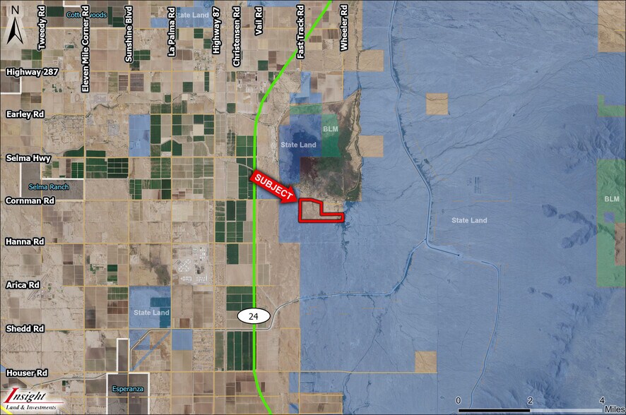 Property is located just 2 miles east of Highway 87 between the City of Coolidge and The City of Eloy. Nikola facility is 2 miles south of the subject property (currently under construction October 2020). Property bound by State Land to the west and south. Excellent investment or 1031 exchange.