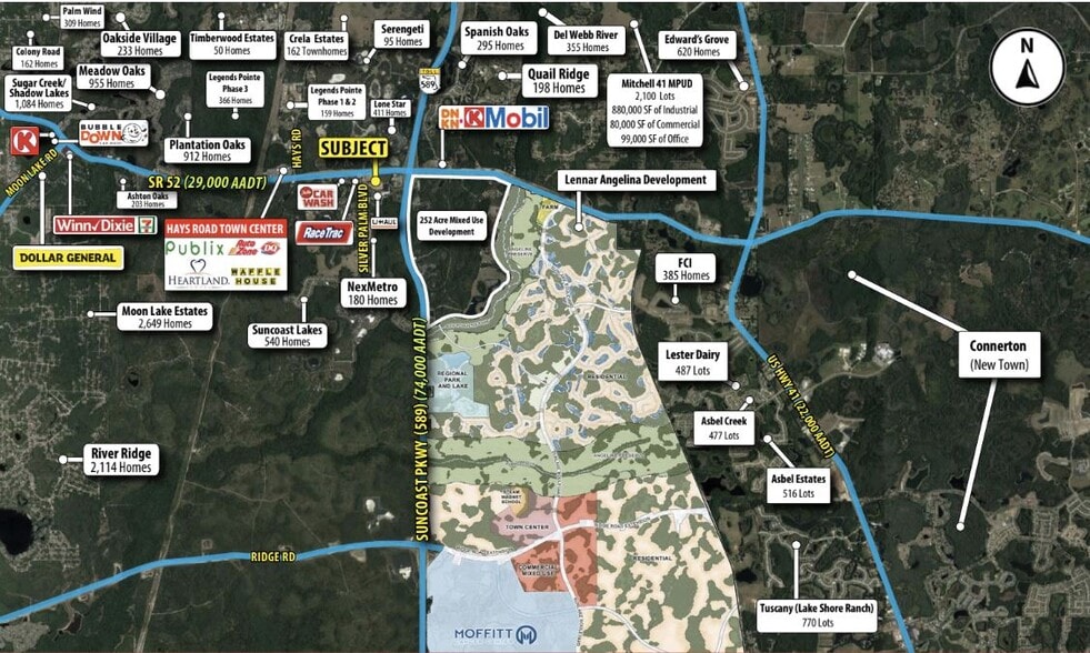 1.00 to 3.70-acre parcels available for ground lease. 456’ of frontage along SR 52 (29,000 AADT). First lighted intersection off the Suncoast Parkway (SR 589). Local retailers include Publix Super Market, Circle K, Dunkin’, RaceTrac, Dairy Queen, Auto Zone, and Waffle House. Lennar acquired 5,100 acres on the East side of SR 52 and Suncoast Parkway for future residential development to allow up to 11,495 homes, 5.4 million SF of commercial and office uses (Under Construction). Moffitt Cancer Center and Research Institute acquired 775 acres from Lennar for a 1.4 million SF $191 million dollar research facility, which will create 14,500 jobs. (Under Construction) Demographics include a population of over 40,000 with an average income of more than $87,000 within a 5-mile radius
