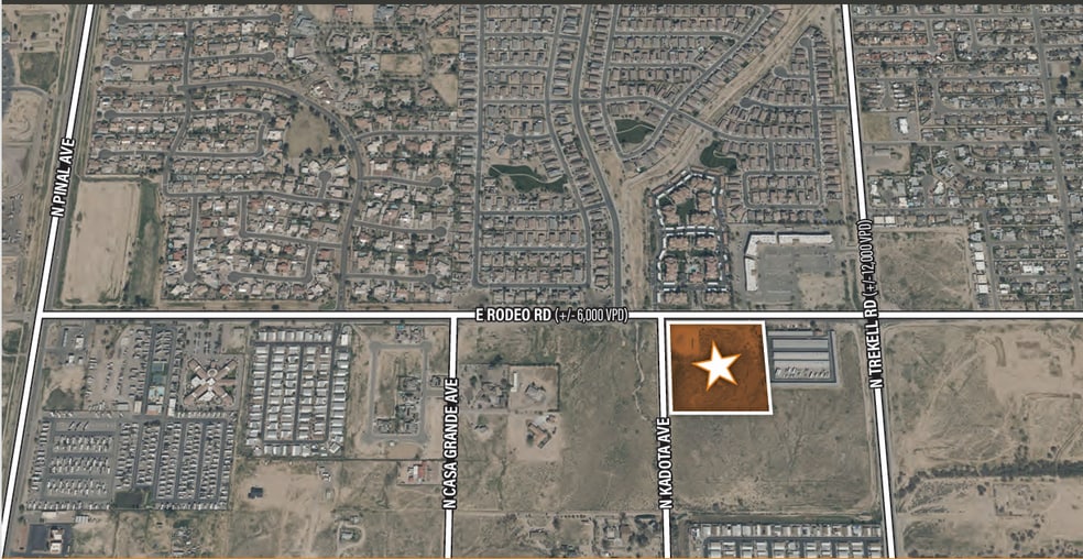 This ±8.37-acre commercial parcel offers a rare opportunity to capitalize on Casa Grande’s accelerating growth trajectory. Strategically positioned at the southwest corner of Trekell Road and Rodeo Road, the site benefits from flexible B-2 zoning and sits directly in the path of major residential and commercial development. With ±12,000 vehicles per day on Trekell and ±6,000 on Rodeo, the property enjoys high visibility and accessibility. Casa Grande is rapidly emerging as Pinal County’s largest city and tax base, fueled by significant industrial and employment investments. Nearby employers include Lucid Motors, Kohler Co., and Chang Chun, contributing to a robust labor pool and economic vitality. The site is also supported by direct access to Interstates 10 and 8, Union Pacific rail service, and a suite of business incentives including New Market Tax Credits, Foreign Trade Zone designation, and local development programs. Surrounded by retail centers, schools, and recreational amenities, the property is ideally situated for a wide range of commercial uses. The area boasts over 32,000 daytime employees within a 15-minute drive, a population exceeding 53,000 within 3 miles, and an average household income of $79,215. With multiple multifamily and build-to-rent projects underway nearby, this corner lot is primed for immediate development and long-term value.