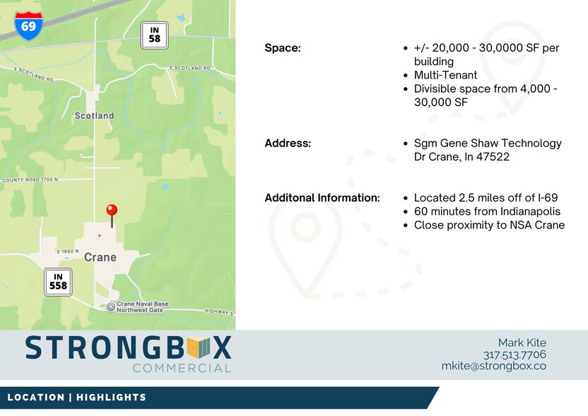 Multi-Tenant development, two buildings, +/- 20,000 - 30,0000 SF per building Located 2.5 miles off of I-69 60 minutes from Indianapolis Close proximity to NSA Crane