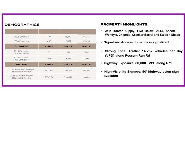 Outlots now available in Mansfield, Ohio. Wal-Mart Supercenter generates over $100 million per year in annual sales. Other highlights include: *This is a dynamic retail trade area for the southern and eastern portion of Mansfield, including local communities such as Lexington and Belleville. *Traffic signals on State Route 13 and at the access drive that leads directly into this development. *Tractor Supply and Five Below are under construction and will be part of the center. Opening Fall, 2025 *Freeway pylon signage available. *Join other restaurant players like STEAK-N-SHAKE, CRACKER BARREL, APPLEBEE'S, BOB EVANS, WENDY'S, and CHIPOTLE. *Located at Interstate 71 and Route 13 interchange (exit 169). This is an emerging retail area for Mansfield, and it has the highest concentration of wealth in the Mansfield, Ohio area.