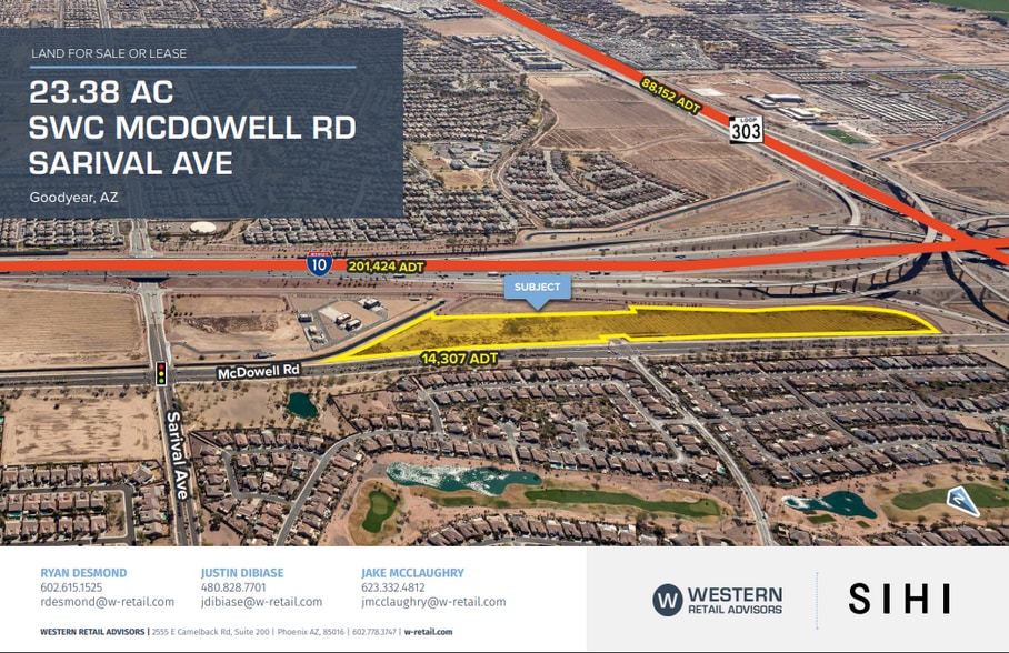 Located at one of Goodyear’s most strategic commercial intersections, this 23.38-acre offering at the southwest corner of McDowell Road and Sarival Avenue presents a rare opportunity to secure a large, highly visible development site in one of the fastest-growing cities in the West Valley. With strong traffic patterns, expansive frontage, and signalized corner positioning, the property delivers the type of exposure and long-term value creation that C-2 land buyers seek. The site benefits directly from Goodyear’s exceptional economic momentum, fueled by sustained residential growth, major employer expansion, and robust demand for new retail, medical, and service-oriented commercial uses. Traffic counts along the McDowell corridor and the Sarival arterial reflect the area’s continued population inflow and support a broad range of development strategies, including multi-pad layouts, retail power components, or a large single-user campus.