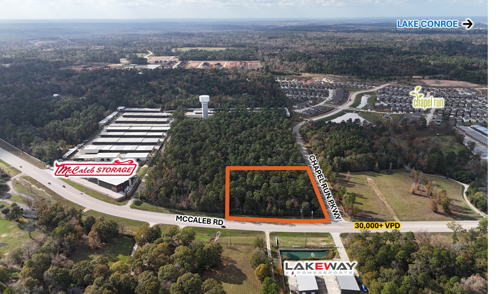• 3 Acres • Site is situated at the Intersection of McCaleb Rd & Chapel Run • High visibility along Major Thoroughfare • Utilities: Midsouth Water Available • Frontage: Approximately 355 Ft. on McCaleb Rd. & Approximately 370 Ft. on Chapel Run Pkwy • Outside of the City of Conroe Temporary Development Moratorium • Up To Two (2) Curb Cuts Available on Chapel Run