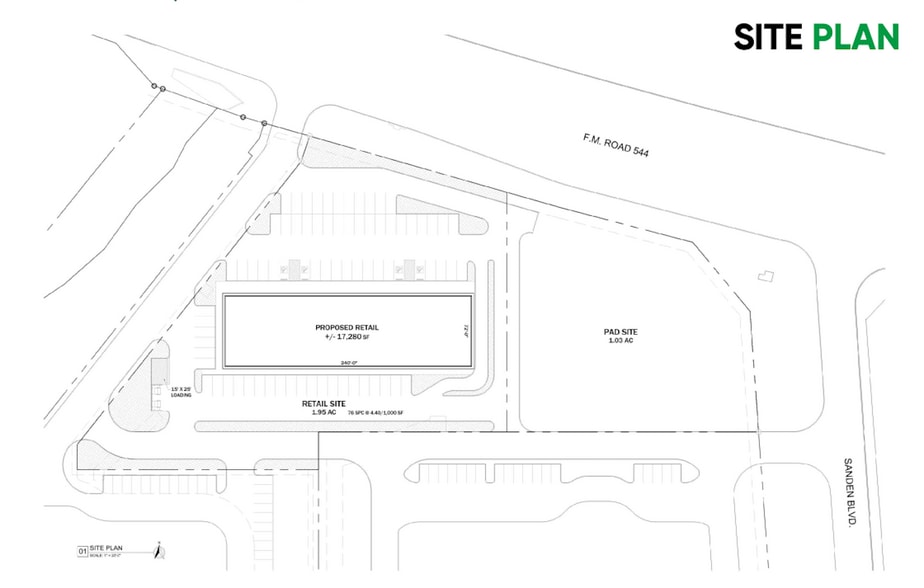 - The property features a highly visible pad site and retail strip space, strategically located at the intersection of FM 544 and Sanden.