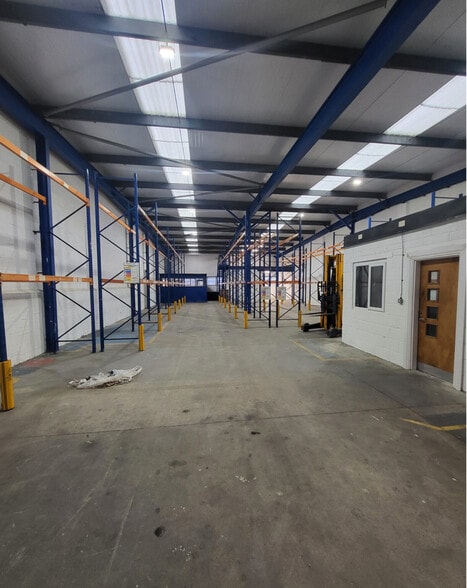 Hi specification industrial unit, 4,000 square foot, 5 mtr wide electric roller shutter door, 3 phase power, separate office, kitchen and toilet block, skylights in every bay so very little need to use lights, plenty of space for loading and unloading outside, separate lockable safe room, separate workshop, price is £15,000 pa PLUS vat. (Racking can be purchased from previous tenant or removed)