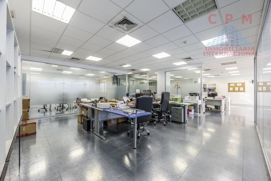 El interior está compuesto por un hall de recepción, una gran zona de trabajo diáfana dividida con mamparas de vidrio, despacho ejecutivo, sala de reuniones, office, zona de archivo o almacén y un aseo completamente equipado. Las especificaciones técnicas incluyen suelo técnico, falso techo, ventanas de aluminio, calefacción y aire acondicionado por bomba de frío/calor. También dispone de sistema contra incendios y dos plazas de garaje incluidas.