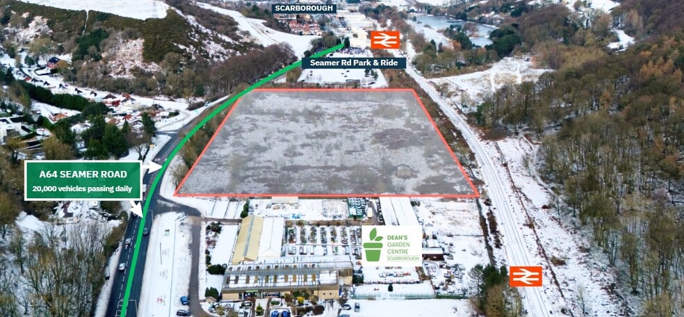 DESCRIPTION The subject site is currently underutilised grassland which falls into two separate ownerships. Located on the east side of Seamer Road which is 3 km south- west of Scarborough Town Centre. Combined, the development land totals an approximate acreage of 8 acres. Dean's Garden Centre, the owners of which own part of the land, is located immediately to the south with Seamer Road Park and Ride situated immediately to the north. The majority of the site sits within Flood Zone 1, with only a small section in the north-eastern corner being within Flood Zone 2. The Scarborough train line, which connects with York and Hull, runs along the eastern flank of the site. Road access into the site will be directly off Seamer Road via the existing access/egress already in situ and utilised by Dean’s Garden Centre.