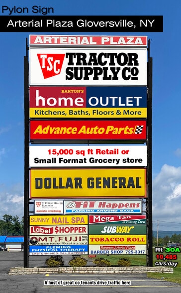Arterial Plaza, Gloversville, NY 12078, between Fifth Ave and Second Ave's traffic signals on NYS Rt 30A, home to Tractor Supply Co, Barton Home Outlet, Advance Auto Parts, Burger King, SubWay, Label Shopper, Mt Fuji Chinese Restaurant, Barbershop, Tobacco Shop, Chiropractor, Physical Therapist, Gym and Cafe (Fit Happens) and more, next to NBT Bank with near chain leading deposits and Pizza Hut, opposite the Hannaford and the Runnings, McDonald's, House of Pizza, and Dunkin Donuts