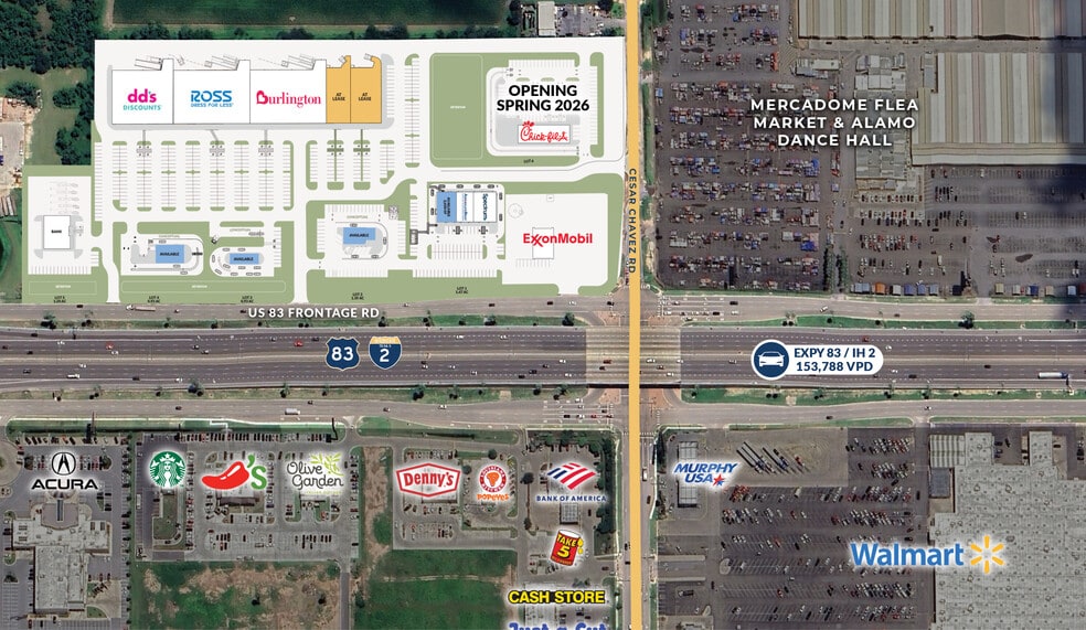 New 100,000 SF Regional Power Center Pylon Signage Facing Expy 83/IH-2 High Traffic Retail Corridor End Cap with Drive Thru 3 Pad Sites