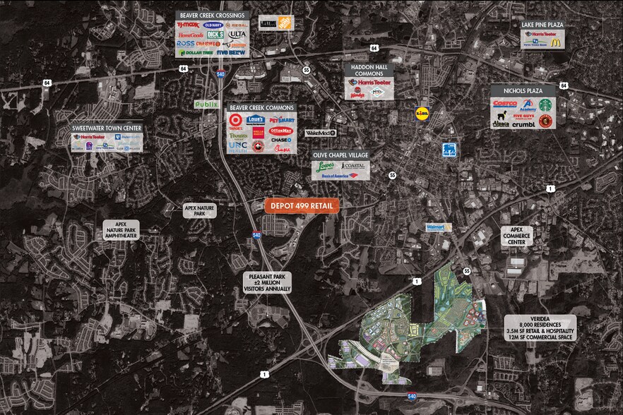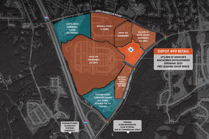 Located at one of Apex’s newest high density mixed-use developments, Depot 499 is a 200-acre master planned community consisting of nearly 1,500 luxury residential units and a ±37,000 SF Food Lion opening Summer 2027 ±13,330 SF of high-visibility retail and restaurant space available at signalized intersection with full movement Less than half a mile from I-540 and minutes from Downtown Apex Exceptional demographics with $185,743 average household income in a 3-mile radius Close proximity to several schools and Pleasant Park, a new 92-acre premier public park and athletic complex drawing more than 2 million visitors annually