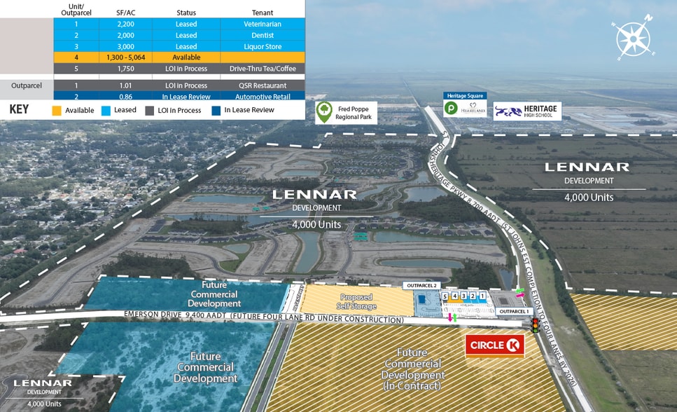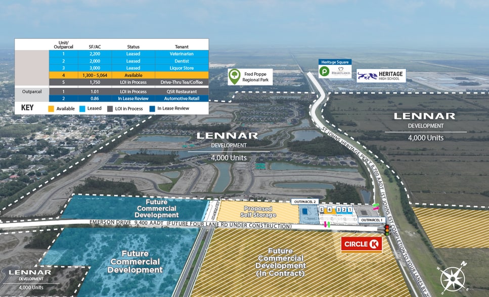 Located in Brevard County’s largest city, Palm Bay, which is experiencing massive amounts of residential growth with over 14,000 new homes approved or under construction within 3-miles of this location. Nearby the major intersection of the St. Johns Heritage Parkway and Emerson Drive, which is the commercial component to Lennar’s 4,000 home community, Everlands, which surrounds these parcels. The traffic signal here is fully funded and approved and is scheduled to be installed later this year. Directly north is the Platt Ranch that has approvals for 4,672 homes, approximately 500,000 SF of commercial and multiple schools with a 1,700 student capacity. The 4-laning of St. Johns Heritage Pkwy from Hwy 192 to Malabar Rd is scheduled to begin also later this year and the 4-laning of Emerson Drive has already commenced to the east of this site and shall continue to St. Johns Pkwy. The St. Johns Heritage Pkwy was constructed for residents living in this area of southwest Brevard County to easily access the surrounding areas and is the primary route for local residents heading to work which is primarily to the north. The St. Johns Heritage Pkwy is to be extended south from Malabar Rd ultimately connecting back into Interstate 95. Just over two miles to the south there is a new Publix anchored shopping center going in at the northwest corner of St. Johns Heritage Pkwy & Malabar Rd. With minimal commercial opportunities on the St. Johns Heritage Pkwy makes this the premiere commercial opportunity There are approximately 2,500 students in this area with 1,700 additional planned. Address: St. Johns Heritage Parkway & Emerson Drive Pricing: Call for Pricing Guidance Space Size: 1,300 SF to +/- 6,814 SF 0.86 Acre & 1.01 Acre Outparcels (Ground Lease or Purchase) Frontage: +/- 300’ on St. Johns Heritage Pkwy +/- 500’ on Emerson Drive Estimated Delivery: Q4 2026 Access: St. Johns Heritage Pkwy & Emerson Dr AADT: 9,400 Emerson / 8,700 St Johns Heritage