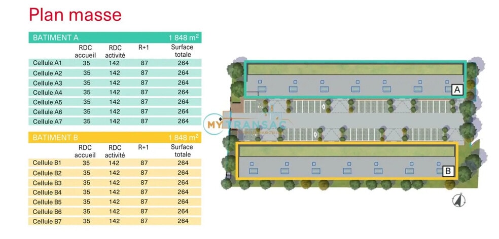 My Transac vous propose à la vente des locaux d'activité d'une surface de 264m² situé à STAINS avec la possibilité de regrouper plusieurs lots Prestations activités : 3 parkings / cellule 1 accès véhicule léger + 1 porte vitrée pour le hall / cellule d'activité Accès de plain-pied par porte sectionnelle à manoeuvre manuelle de 3m50 x 3m50 Haut. libre max. ss poutre : 7 m Hauteur mezzanine 4m30 Résistance sol : 3 T/m² Tarif jaune 48 kVA Dallage industriel quartzé Eclairage par armature industrielle LED en sous face de bac 200 lux Chauffage par aérotherme électrique ou gaz Ossature : Métallique Couverture : Bac acier Prestations Bureaux : Charge : 500 kg/m² au RDC et 350 kg/m² au R+1 Carrelage au RDC / Moquette dalle ou PVC au R+1 LED encastrés dans les faux-plafonds Plinthes périphériques Courant fort / faible à la charge de l'acquéreur Panneaux rayonnants électriques avec commande centralisée 2 sanitaires dont 1 PMR au RDC Conditions financières : Disponibilité : T4 2024 Prix de vente : 2170 Euros HD / m² Impôt Foncier : Environ (17Euros / m² / an) Honoraire de commercialisation : 2% HT du prix net vendeur Accès : Autoroute A1 à 7 min Route 15 min de Paris Aéroport à 16 min de l'aéroport Roissy Charles de Gaulle Bus Paul Vaillant Couturier (BUS-11, BUS-Vitavil), Clos Hanot (BUS-255, BUS-356) Métro St-Denis - Université (METRO-13) à 7 min avec les bus 356 ou 255 RER Gare de Pierrefitte Stains (RER-D) à 20 min avec le bus 268