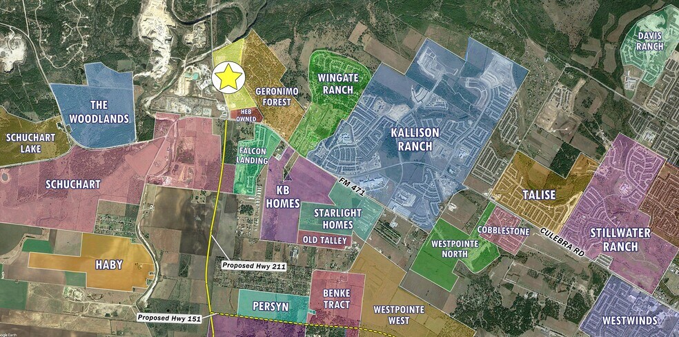 Property has two access points to Culebra road and multiple locations along Hwy 211. The electrical easement through the site is abandoned and will move to the frontage as the property is platted.
