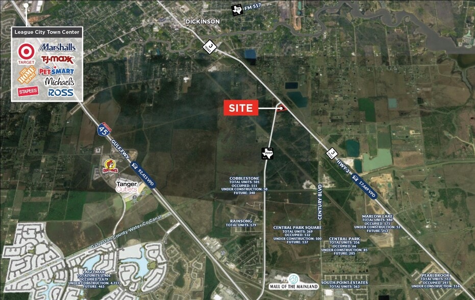 - 3.68 acres on the hard corner of Hwy 3 and FM 2004