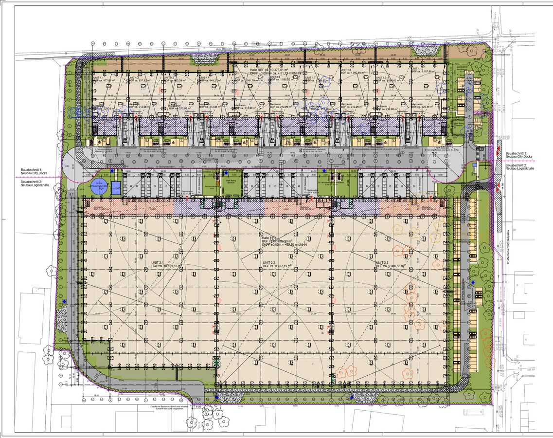 Industrial units are available for lease, offering usable areas ranging from 1,153 m² to 12,458 m² (inclusive office and flex area). The modular layout allows each unit to be expanded and adapted to meet a wide variety of operational requirements. The property comprises a total of 10 units. These modern City Dock commercial spaces are designed for small and medium-sized enterprises, start-ups, and online retailers. Thanks to their flexible configuration and modular expansion options, the units are suitable for a broad spectrum of industries, including trade, commerce, production, and logistics.