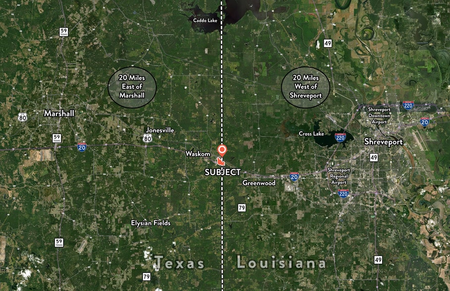 REDUCED PRICE / MOTIVATED SELLER The property is in close proximity, or has access to, the Texas Travel Information Center, Interstate 20, Highway 80, Spur 156, and the Progress Rail Services. Waskom, “The Gateway to Texas”, is located just 20 miles west of Shreveport, LA. the third largest city in Louisiana. Shreveport-Bosier tourism numbers were in excess of 2.2 million visitors in 2016 alone due to their large casino and entertainment districts.