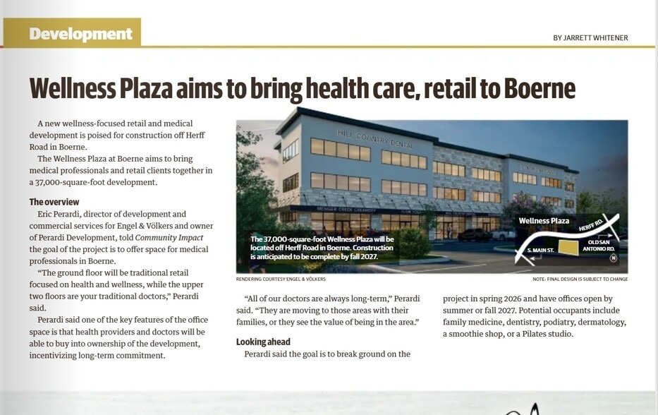 A 37,000 SF Class A Health & Wellness Destination on Herff Road. Wellness Plaza at Boerne is a premier 37,000-square-foot mixed-use medical and retail development strategically located on Herff Road between Old San Antonio Road and South Main Street in Boerne, Texas. Designed as a 7-day-a-week health and wellness hub, this Class A development offers a unique combination of specialty medical offices and high-visibility ground-floor retail. With strong demographics, high household incomes, and rapid population growth, Wellness Plaza at Boerne offers a rare opportunity for medical professionals and wellness-focused businesses to establish a presence in one of Central Texas’ fastest-growing communities.