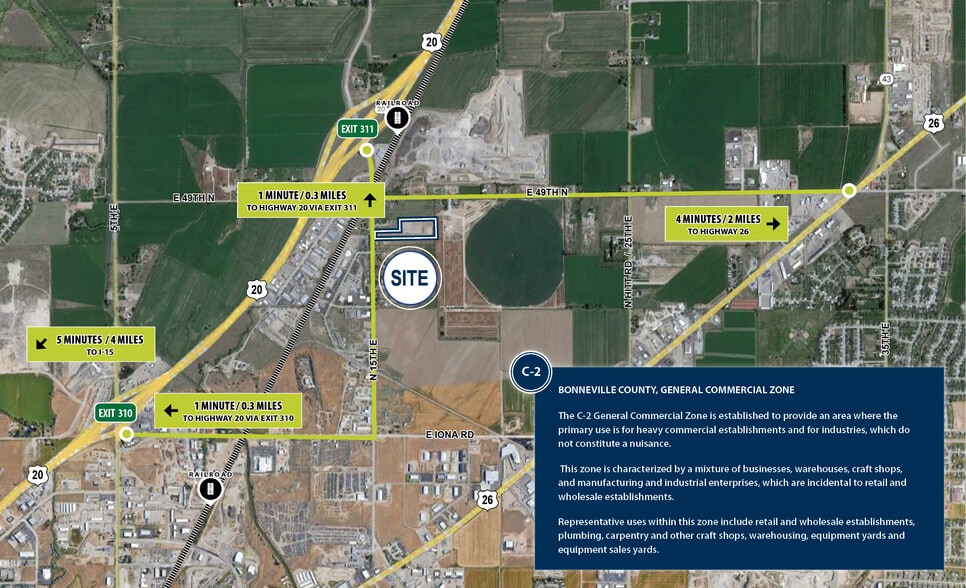 Introducing prime industrial development land in Bonneville County, Idaho Falls. This property offers optimal accessibility, with frontage and direct access off N 15th E - conveniently located at Highway 20's Exit 311. The property benefits from quick connections to major arterials, with Highway 20 just 1 minute away, Highway 26 within 4 minutes, and I-15 access within 5 minutes. Zoned as General Commercial, the property allows for diverse development opportunities, including potential for self-storage facilities.