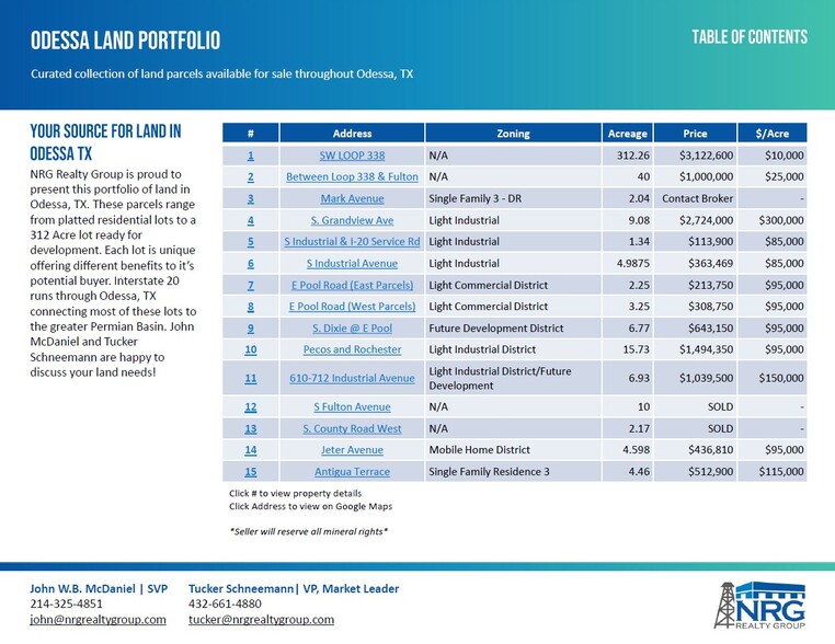 NRG Realty Group is proud to present this portfolio of land in Odessa, TX. These parcels range from individual residential lots to a 312 Acre lot ready for development. Each lot is unique offering different benefits to it’s potential buyer. Interstate 20 runs through Odessa, TX connecting most of these lots to the greater Permian Basin. John McDaniel and Tucker Schneemann are happy to discuss your land needs! Lot 7: This offering features 3 parcels combined for a total of 2.25 Acres of land zoned Light Commercial District. The parcels are all rectangular with excellent access. The parcel is located on Pool Rd that runs parallel to Interstate 20. Lot 8: This offering features 3 parcels combined for a total of 3.25 Acres of land zoned Light Commercial District. The parcels are all rectangular with excellent access. The parcel is located on Pool Rd that runs parallel to Interstate 20, and also fronts Rochester Ave. Lot 9: This parcel features 6.77 Acres of land zoned Future Development District. The site is rectangular. Excellent access from E Pool Rd and S Dixie Blvd just off of Interstate 20. Lot 10: This parcel features 15.73 Acres of land zoned Light Industrial District. The site is a bit irregular shape but all space is useable. The site can be accessed by Rochester Ave or Pecos St – just off of Interstate 20.