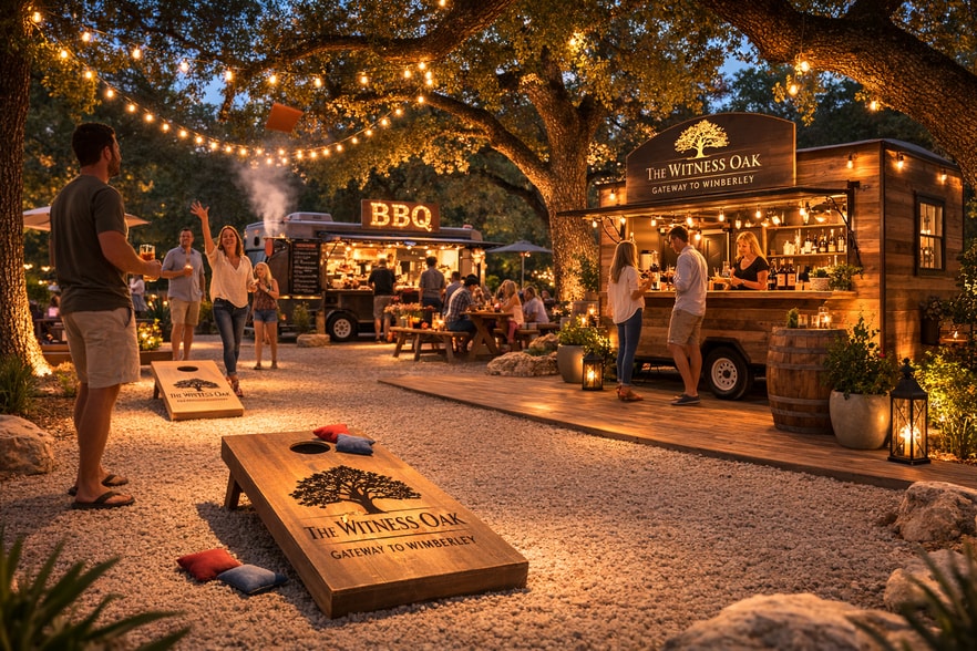 The property’s mature oak canopy and open outdoor areas create a natural setting well suited for family-oriented gathering spaces, including casual food vendors, wine tasting experiences, lawn games such as cornhole, relaxed mahjong tables under the trees, and nature-inspired play areas for children.