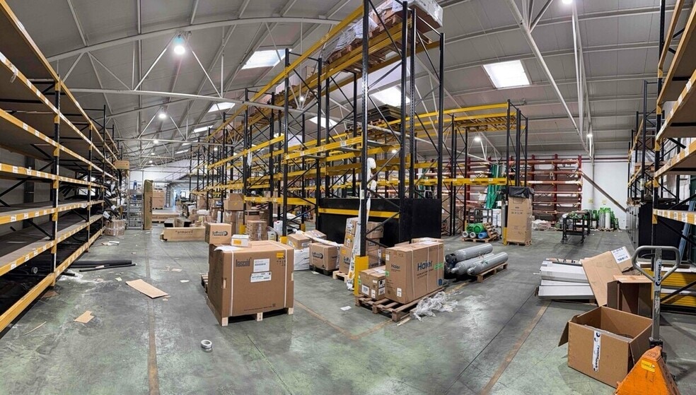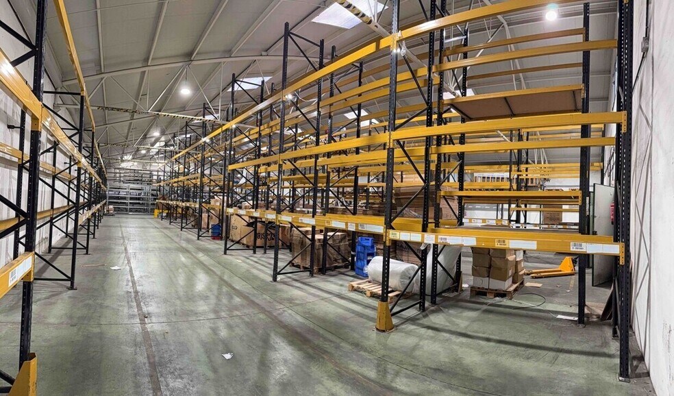 Cuenta con estructura metálica y cubierta tipo sándwich a dos aguas, ofreciendo una altura libre aproximada de 5 metros que facilita la operativa de almacenaje.