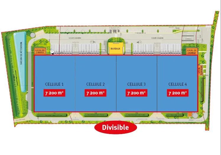 Cette plateforme logistique de 30 490 m², située à Tournan-en-Brie, se divise en quatre cellules de 7 200 m² chacune, offrant une modularité idéale pour les activités logistiques et industrielles. Elle dispose de 32 quais niveleurs, d’une hauteur sous poutre de 11 m (12 m maximale) et d’une charge au sol de 5 T/m², garantissant une capacité de stockage optimisée. Les équipements incluent un éclairage LED, des murs coupe-feu et une toiture isolée avec centrale photovoltaïque pour une performance énergétique durable.