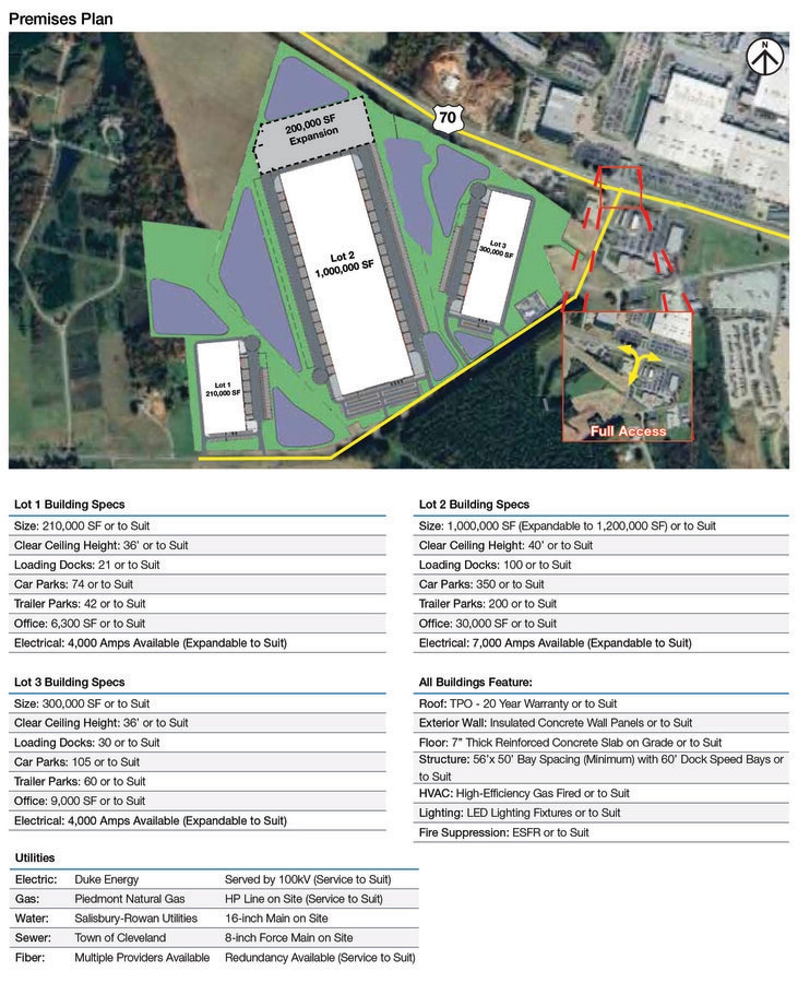 Cleveland Commerce Park offers a shovel-ready industrial opportunity in the heart of the Charlotte MSA, designed for large-scale manufacturing and distribution users. This Duke Energy-certified site provides build-to-suit flexibility up to 1.71 million square feet, with modern specifications including 36’–40’ clear heights, ESFR fire suppression, LED lighting, and 7-inch reinforced concrete floors. Column spacing of 56’ x 50’ with 60’ dock speed bays ensures operational efficiency, while ample trailer and car parking supports high-volume logistics. Strategically located with direct frontage on US Highway 70 and full access to I-77, I-85, and I-40, the park offers seamless connectivity to major transportation corridors. Charlotte Douglas International Airport is just 47 miles away, and the Ports of Charleston and Savannah are within a day’s drive, enabling global distribution capabilities. Businesses benefit from a skilled labor force of over 1.48 million within a 45-minute radius and attractive state and local incentives, including tax exemptions and workforce development programs. With heavy power availability, robust infrastructure, and proximity to major interstates, Cleveland Commerce Park is an ideal solution for companies seeking scalability, speed-to-market, and long-term operational advantages in one of the Southeast’s fastest-growing industrial hubs.