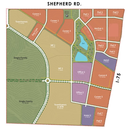 - ±531 AC master-planned mixed-use. Commercial/Flex: ±228.5 AC; subdividable ±1–20+ AC. Residential: ±303.2 AC (Pods: ±59.8, ±64.9, ±48.8, ±46.2 AC).